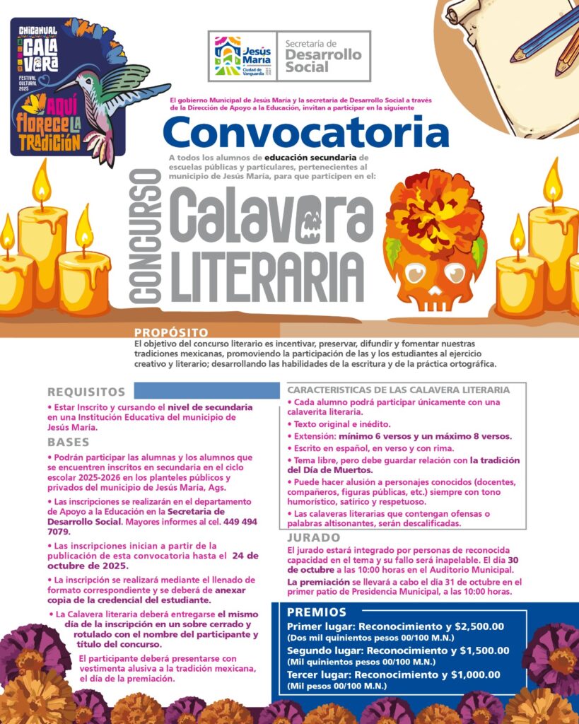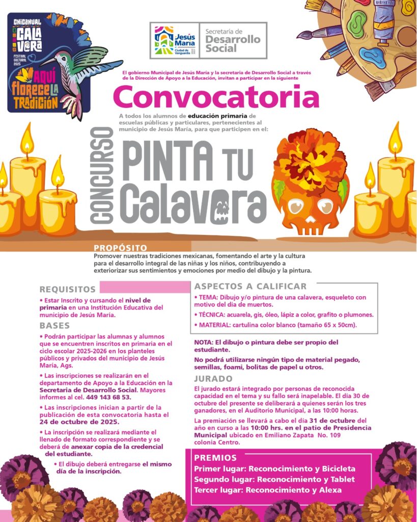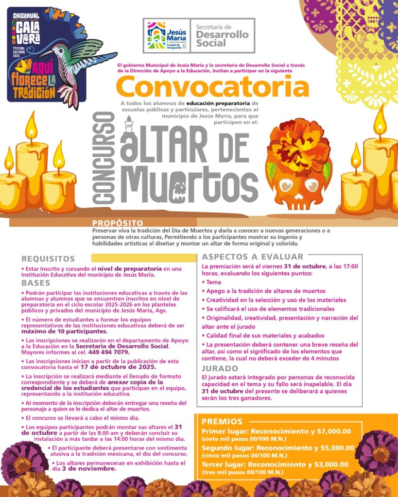 Con el objetivo de preservar las tradiciones mexicanas y fomentar la participación, el talento y la identidad cultural de la comunidad estudiantil, el Gobierno Municipal de Jesús María, a través de la Secretaría de Desarrollo Social, presentó tres convocatorias dirigidas a estudiantes de distintos niveles educativos.